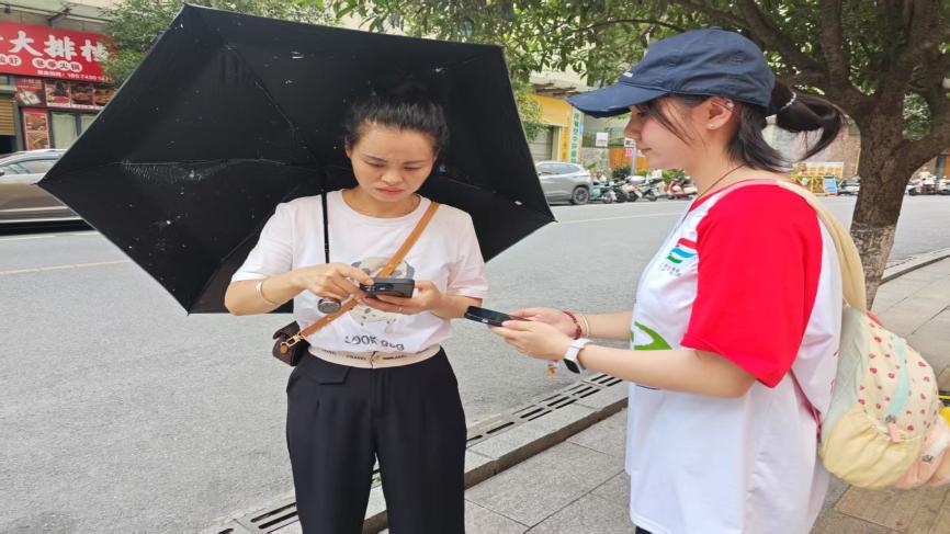 图为“小杏仁”团队成员对居民进行问卷调查 杨林菲凤摄