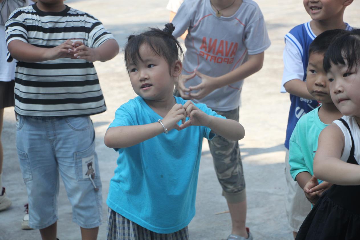 在教学过程中,孩子们自发分组,以童真和创意演绎舞蹈:有的孩子排成纵队,随着节奏蹦跳并变换队形;有的孩子分散站立,用拍手和比心的动作相互呼应。孩子们眼神明亮、姿态活泼,将对舞蹈的喜爱融入到每一个动作中。休息的间隙,几个孩子追着志愿者跑,有的拽拽志愿者的衣角,有的凑到志愿者身旁,小声地分享:“跳这个舞可好玩啦!”“我刚才没跟上节奏,下次肯定能跳得更好!”质朴的话语中充满了对参与活动的欢喜。