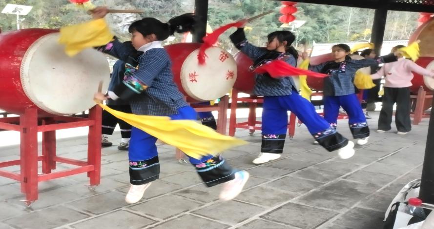 (图为孩子们进行鼓舞排练摄自坪朗村村秘书)