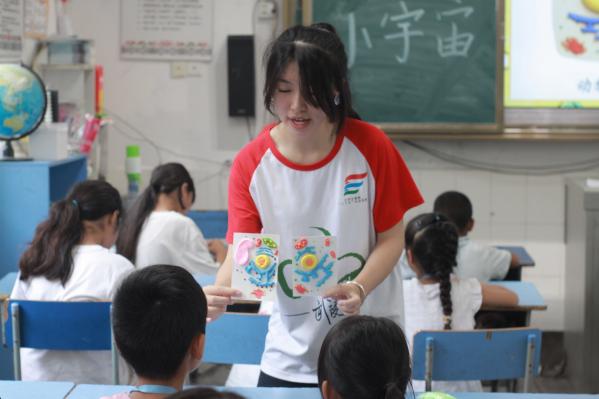 (图为志愿者周朋琴向学生展示作品 陈晒 摄)