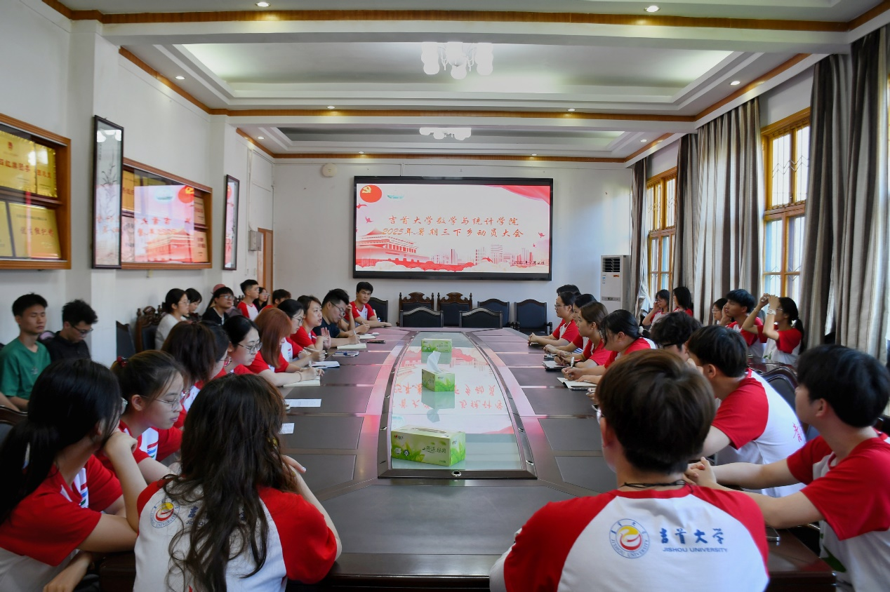本网讯(通讯员 张安琪 尹堂宇 刘雨欣)为深入贯彻落实党的二十大精神,引导青年学子在社会实践中受教育、长才干、作奉献,吉首大学数学与统计学院于7月4日上午在砂子坳校区1209会议室召开2025年暑期“三下乡”社会实践活动动员大会。数学与统计学院党委副书记彭校辉、学工办老师张毓芯、阿依图尔孙·图尔孙及“数时代”社会实践服务团全体成员参加本次会议,会议由张毓芯主持。