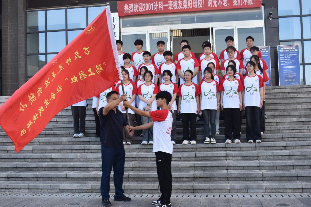 仪式的最后环节,院长廖柏林郑重地将实践团旗帜授予团队代表。旗帜飘扬象征青春与责任交接。“编程点亮阳朝路,算法铺就振兴图。保靖县阳朝乡,我们来了!”——实践团成员们满怀激情地齐声宣誓,以此展现他们致力于振兴乡村的决心。随着热烈的掌声,出征仪式顺利结束,实践团正式开始他们的乡村服务之旅。