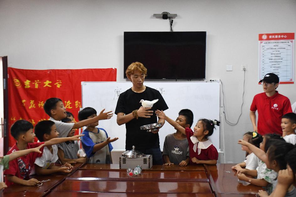 (通讯员 尹堂宇 张安琪 刘雨欣)以魔术独特魅力激发乡村孩子好奇心,借奇幻表演拓宽知识感知维度。7月7日,吉首大学数学与统计学院“数时代”社会实践团在双塘镇双塘村的支教活动中,特邀火星魔术社成员,为孩子们打造了一场融合魔术奇妙体验与知识启发的特别课堂。志愿者们巧用扑克、橡皮筋、金属环等道具,编织奇幻瞬间,灵动鸽子惊喜亮相,引领孩子们踏入魔术搭建的探索之门,在惊叹中埋下对科学、创意追根究底的种子。
