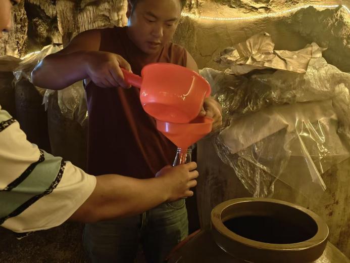 抵达排腊村时,炊烟正从依山而建的吊脚楼间升起,当地酿酒作坊的酒香已在村口弥漫。实践团成员们来不及擦去额头的汗,便围在酿酒师傅的灶台前认真记录:从糯米的蒸煮火候到酒曲的发酵温度,从古法陶缸的密封技巧到设备的改良尝试,每一个细节都被详细写入调研笔记。